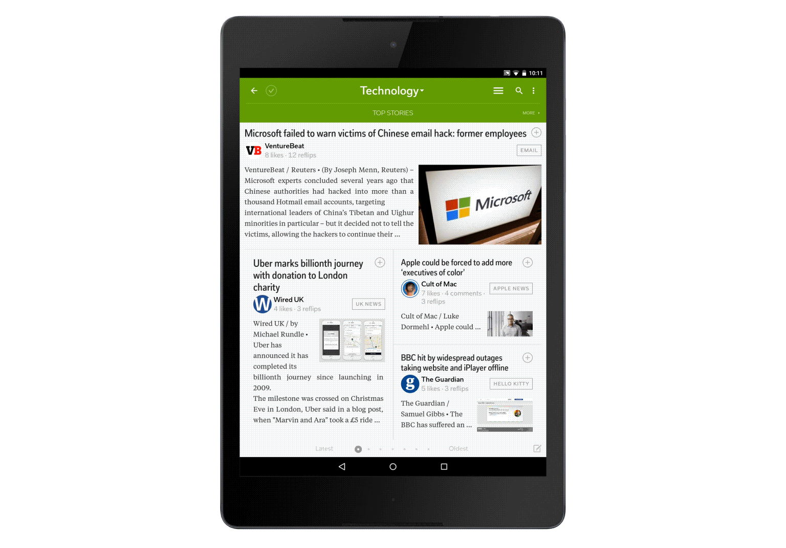 When you tap on a topic, such as 'technology,' Flipboard will display headlines and excerpts from some of the most recently published 'technology' articles.