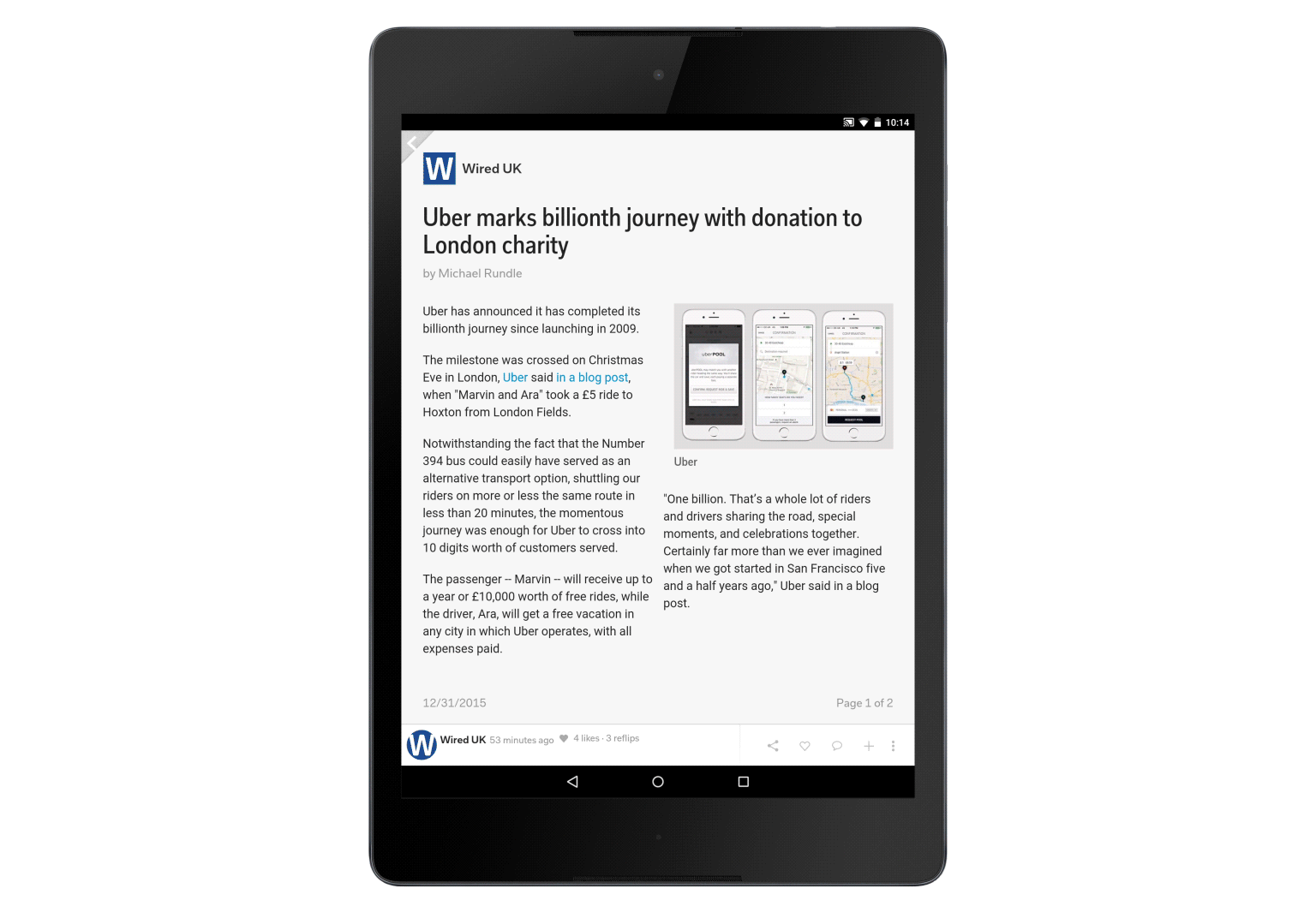 Articles are often broken up into many pages. To continue reading an article, swipe from right to left to 'flip' to the next page. To return to the previous page of the article, swipe from left to right.